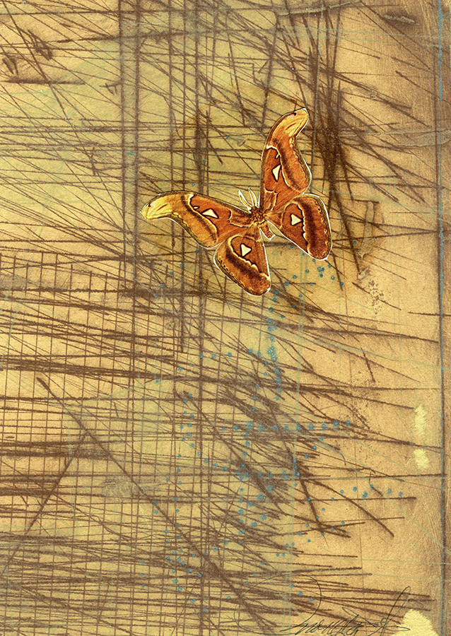 Monotype, 1 color Woodcut, 3 color 3 plate Intaglio, with white pastel on Rives BFK
