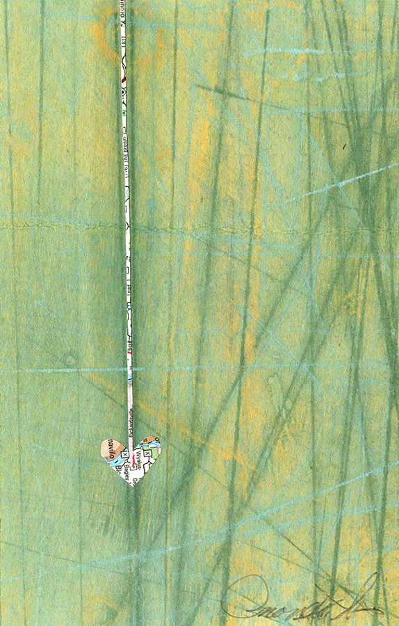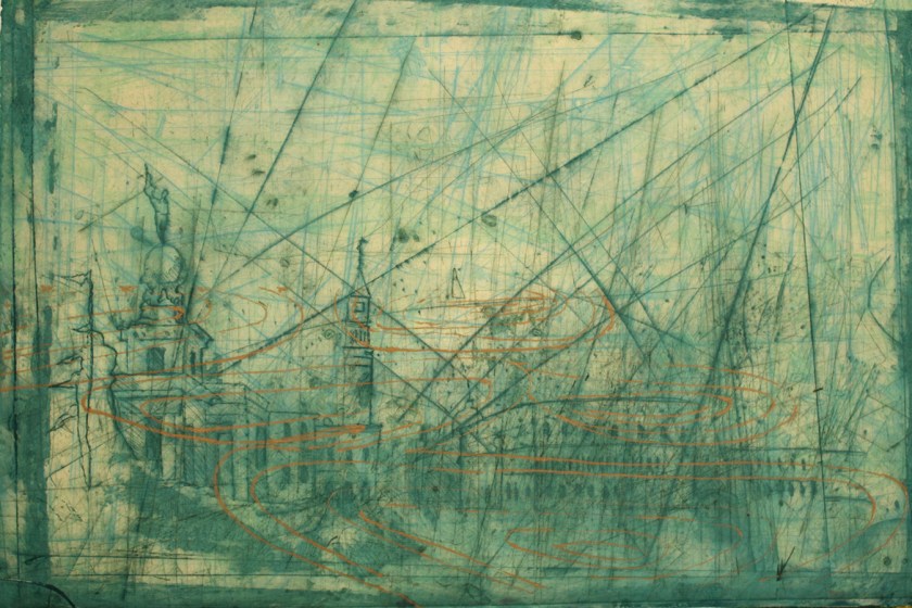 In the summer of 2013 I spent two weeks in Venice, Italy creating prints and watching the water along the canals and lagoons. I created the base prints for what would later become a series of works devoted to the patterns of water in 2013, and subsequent years. A quote from Katherine Anne Porter seems to describe the way water can transport our thoughts and memories to the forefront of our thoughts “…..memory drifted into my mind like a bit of weed carried in a current and caught there…”
