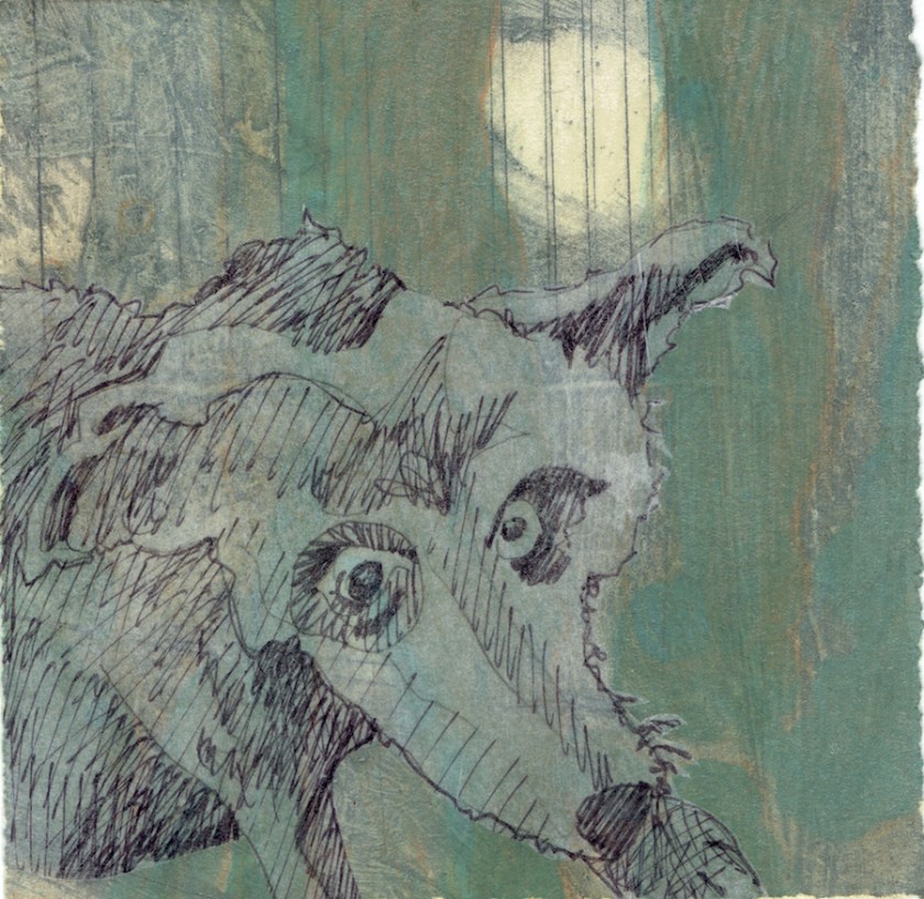 Dog in Full Moon Intaglio, pen, tracing paper on BFK 6″ W x 6” H 2018 NFS digital 24″ x 24″ $200.00