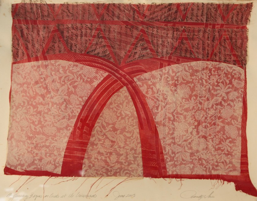 Starch Resist Fabric Created by the Artist, Paper, Ink, Gesso, and Embroidery