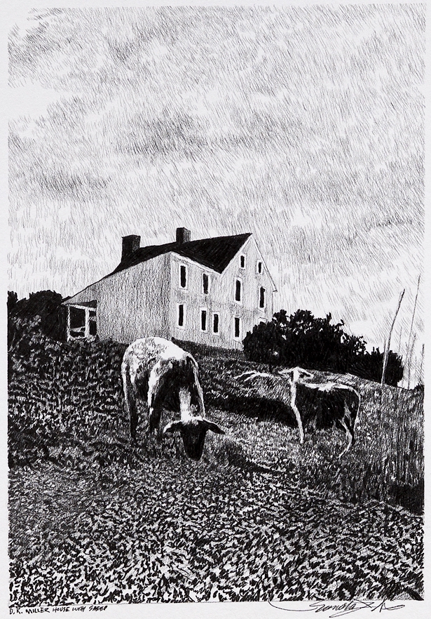 David R. Miller, his wife Margaret and their six children lived in this two-story house along what was in 1862 the newly created Hagerstown Pike which separated the Miller house from the barn. His cornfield was the site of 4 hours of intense fighting that resulted in 8 thousand men killed or wounded. The field became a gravesite making it difficult for Miller to farm his land for several years. Today farmers lease the land and run cattle, sheep and raise crops including corn on the Miller farm. There is no evidence D. R. Miller raised sheep, but the presence of sheep near the house always suggests to me the peaceful and rhythmic nature of life prior to the battle.