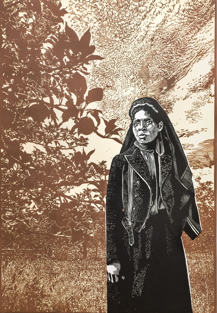 Ms. Taylor served with the 33rd U.S. Colored Troops Infantry Regiment during the Civil War. She was originally hired as a laundress she tended the wounded and taught children and adults to read while serving. She stands here in an apple orchard. Apples are symbols of knowledge, healing and nourishment and in this context signify the historical, cultural, and societal diversity of the United States.