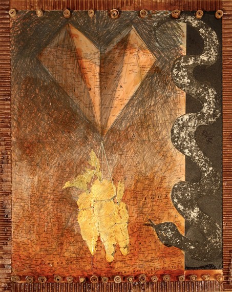 A Promise of Wealth A Promise of Wealth Mixed Media Collage: Intaglio, Maps, Corrugated Cardboard, Shellac, and Gold Leaf 16” W x 20″ H 2005 $350.00 Related