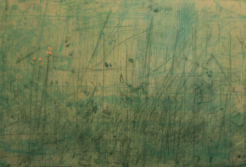 I had been observing water peering within and noticing the correlation between the sky and the land and the impressions of both. I created two works using the same plates and color scheme with the same Collage elements. There two works almost identical except for the title. The other is titled: A wisp of memory