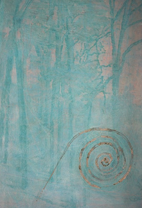 After traveling I returned home to my little house in the woods where I rediscovered the beauty of the large trees that surround me. The spiral and the circle are images that suggest the power of return, the sun, home, and new beginnings built upon history and memory.
