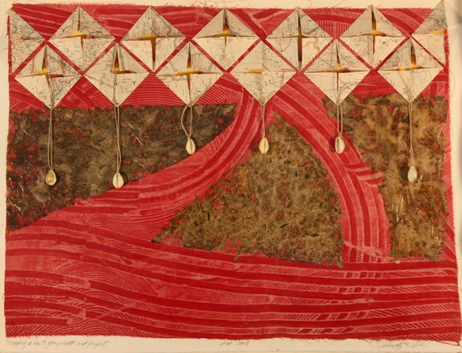 Mixed Media: Starch resist Fabric Created by the Artist, Maps, and Cowrie Shells